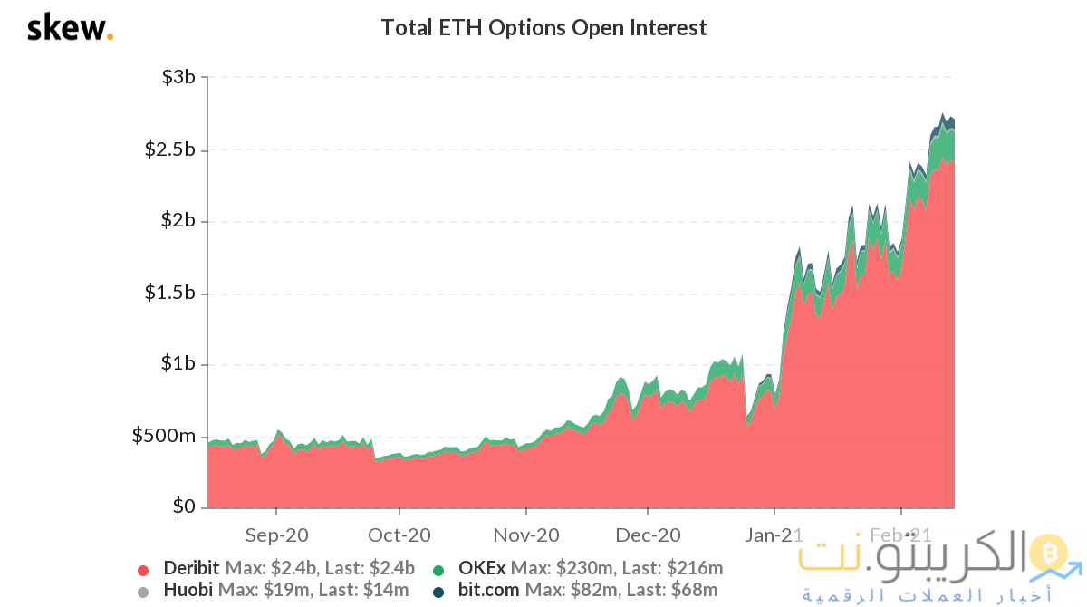 كما لوحظ في الرسم البياني أعلاه ، ظلت Open-Interest على خيارات Ethereum عبر منصات متعددة قريبة من أعلى مستوى لها على الإطلاق مع عرض Deribit ATH في وقت النشر. يشير ارتفاع OI إلى القيمة الحالية لعقود ETH النشطة في الفضاء ، ويمكن أن يؤدي ارتفاع OI دائمًا إلى ارتفاع الأسعار في اتجاه صعودي.