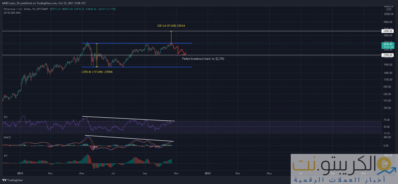 ومع ذلك ، قد تؤدي محاولة الاختراق الفاشلة إلى خسائر فادحة لـ ETH. قدمت الاختلافات الهبوطية على طول مؤشر القوة النسبية RSI و MACD مخاطر مستقبلية إذا كان المضاربون على الارتفاع غير قادرين على تجاوز علامة 4400 دولار عن قناعة. في وقت كتابة هذا التقرير ، تم تداول ETH عند 4083 دولارًا أمريكيًا ، بانخفاض 2.5 ٪ خلال الـ 24 ساعة الماضية.