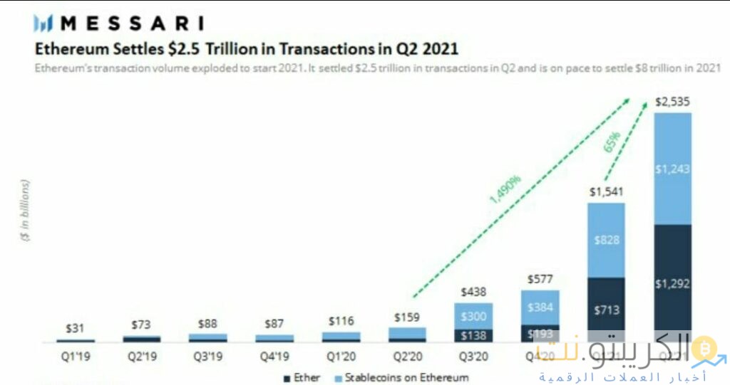 وشهد نفس الشيء نموًا هائلاً خمسة أضعاف وعكس قيمة تزيد عن 577 مليار دولار خلال الربع الأخير من عام 2020. ومن المثير للاهتمام ، أنه شهد ارتفاعًا أسيًا فعليًا هذا العام فقط. كما يتضح من الرسم البياني ، استقرت Ethereum أكثر من 2.5 تريليون دولار في المعاملات خلال الربع الثاني من هذا العام.