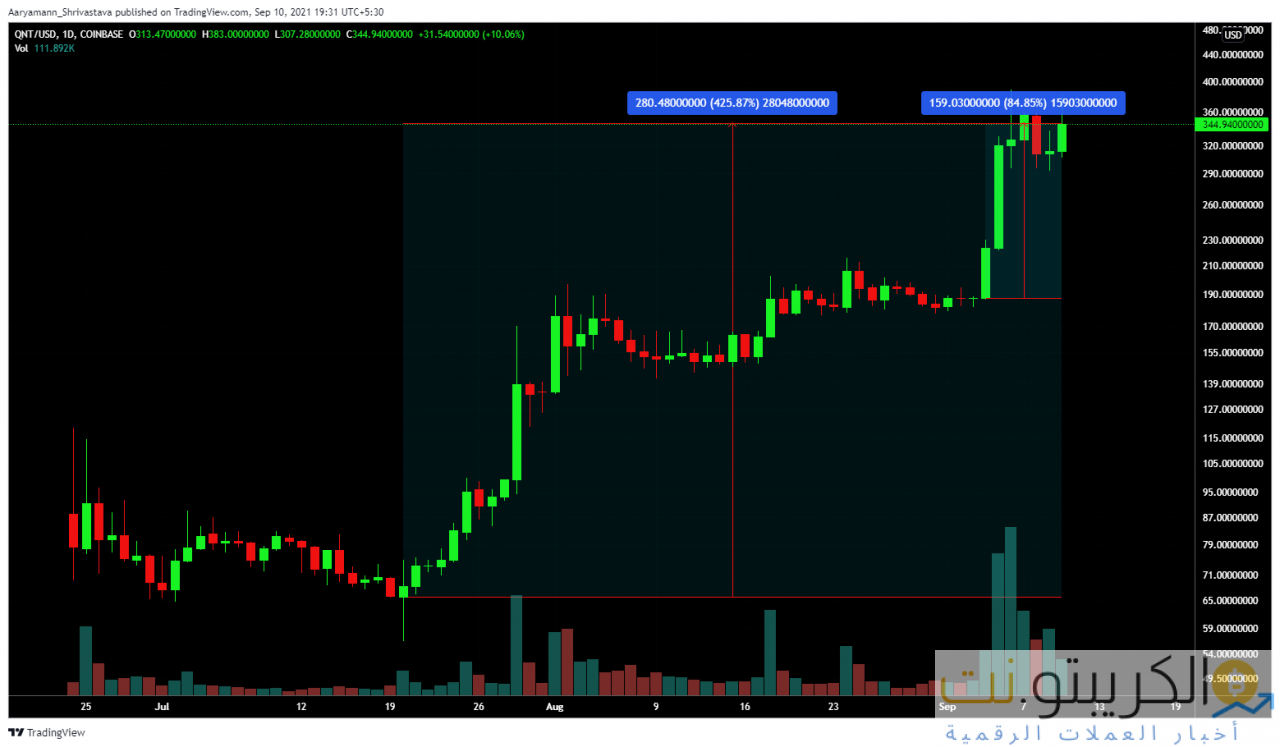 ارتفع الكم بأكثر من 84.85٪ هذا الأسبوع ، على الرغم من انهيار السوق الأخير. في 7 سبتمبر ، عندما شهد معظم السوق انخفاضًا ، ارتفع سهم QNT بنسبة 9٪.