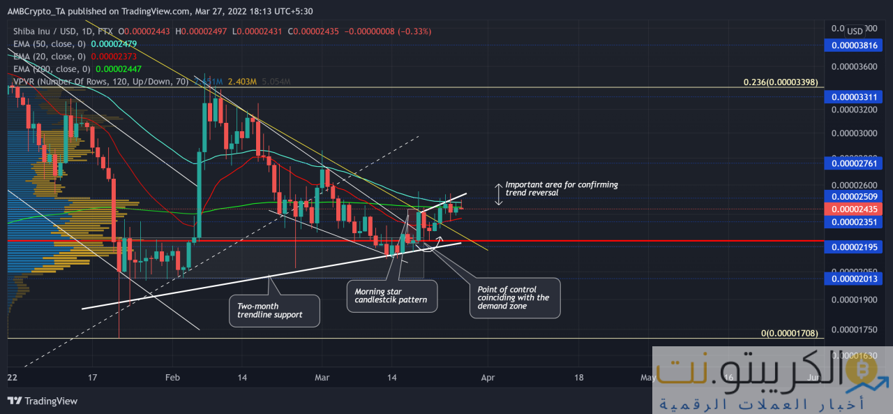 إذا استمر المضاربون على الانخفاض في رفض الأسعار المرتفعة عند المستوى الحالي ، فقد تشهد SHIB تراجعًا قصير المدى نحو المنطقة 0.021 دولار – 0.023 دولار قبل القفز فوق المتوسطات المتحركة الأسية. في وقت كتابة هذا التقرير ، تم تداول سهم SHIB بسعر 0.02435 دولار أمريكي.
