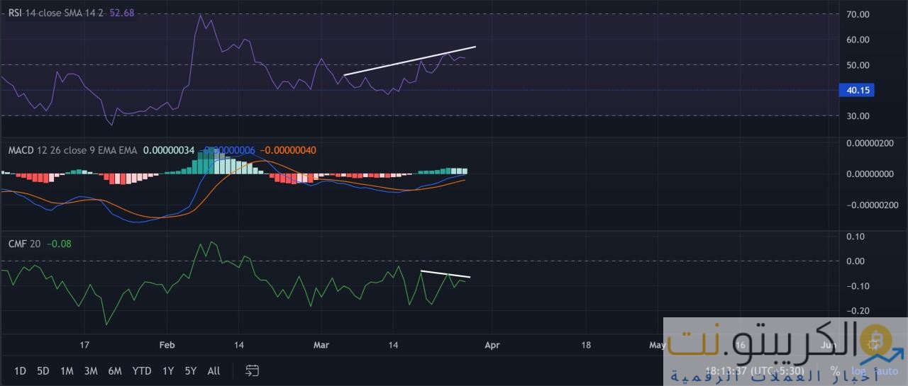 أظهر خط MACD انتعاشًا رائعًا نحو خط الصفر. مزيد من الإغلاق فوق التوازن سيؤكد الاتجاه الصعودي المتزايد. مع ذلك ، تباعد مؤشر CMF هبوطيًا مع السعر بينما شهد قممًا منخفضة.