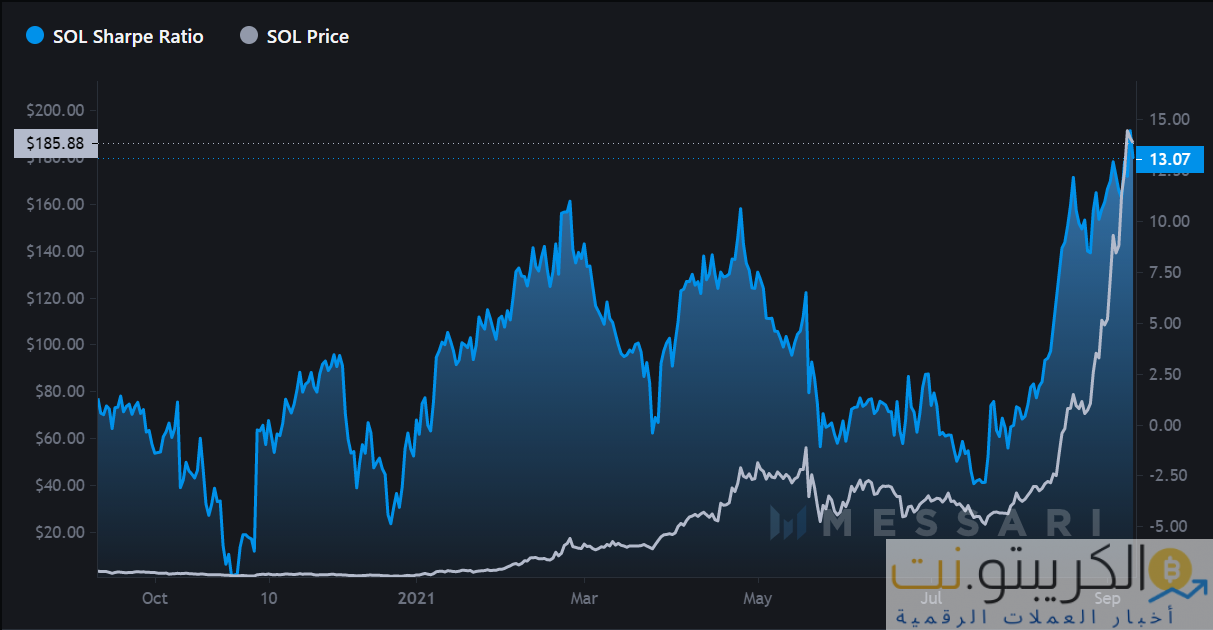 علاوة على ذلك ، كانت القيمة السوقية لشركة Solana أكبر من XRP و Dogecoin في وقت كتابة هذا التقرير. بالإضافة إلى ذلك ، شهدت نسبة شارب في SOL اتجاهًا صعوديًا ثابتًا وقراءة 13.07. على العكس من ذلك ، كان الشيء نفسه بالنسبة إلى Cardano 7.4 و Ethereum كان 2.4.