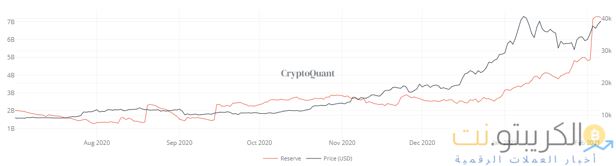 وفقًا لمزود البيانات CryptoQuant ، بلغت احتياطيات العملات المستقرة في البورصات مؤخرًا 7.2 مليار دولار حيث ارتفعت BTC عند 39 ألف دولار. أظهر الرسم البياني أعلاه الارتفاع المفاجئ في العملات المستقرة في البورصات بعد 2 فبراير عندما كان الاحتياطي 4.86 مليار دولار فقط وكانت قيمة BTC قريبة من 34 ألف دولار.