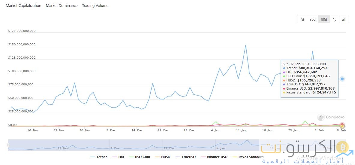 نظرًا لبروزها وانتشارها في دوائر التشفير ، فقد كان Tether مهيمناً أيضًا من حيث حجم التداول. تشير البيانات من CoinGecko إلى أن حجم تداول العملات المستقرة بلغ 91.8 مليار دولار وأن USDT وحده يعوض 88.3 مليار دولار من هذا الحجم.
