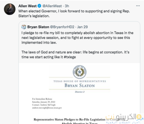 ثم أصدر المرشح ألن ويست بيانا زعم فيه أنه في حال انتخابه “سيواصل ضمان حق مواطنيه في امتلاك واستخدام والاستفادة من تقنيات blockchain من خلال ملكية البيتكوين والعملات الرقمية الأخرى”.