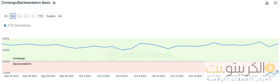 بالإضافة إلى ذلك ، أظهر المنحنى الأمامي لمشتقات FTX اتجاهًا مثيرًا للاهتمام. يوضح مخطط ITB المرفق أدناه أن السوق كان في Contango لأكثر من شهر الآن. Contango هي حالة يكون فيها السعر الآجل للأصل أعلى من سعره الفوري. يحدث الشيء نفسه عادةً عندما يُتوقع أن يرتفع سعر الأصل بمرور الوقت.