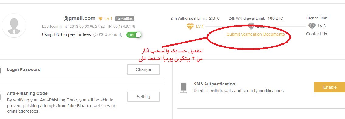 • قم بتفعيل حسابك للمستوى الثاني اذا كان المبلغ في المنصة ايضاً كبير حيث المستوى الثاني من حسابك في منصة بينانس يجعلك تسحب 100 بيتكوين في اليوم الواحد. اما المستوى الأول الغير متحقق منه يتم السحب في اليوم 2 بيتكوين.