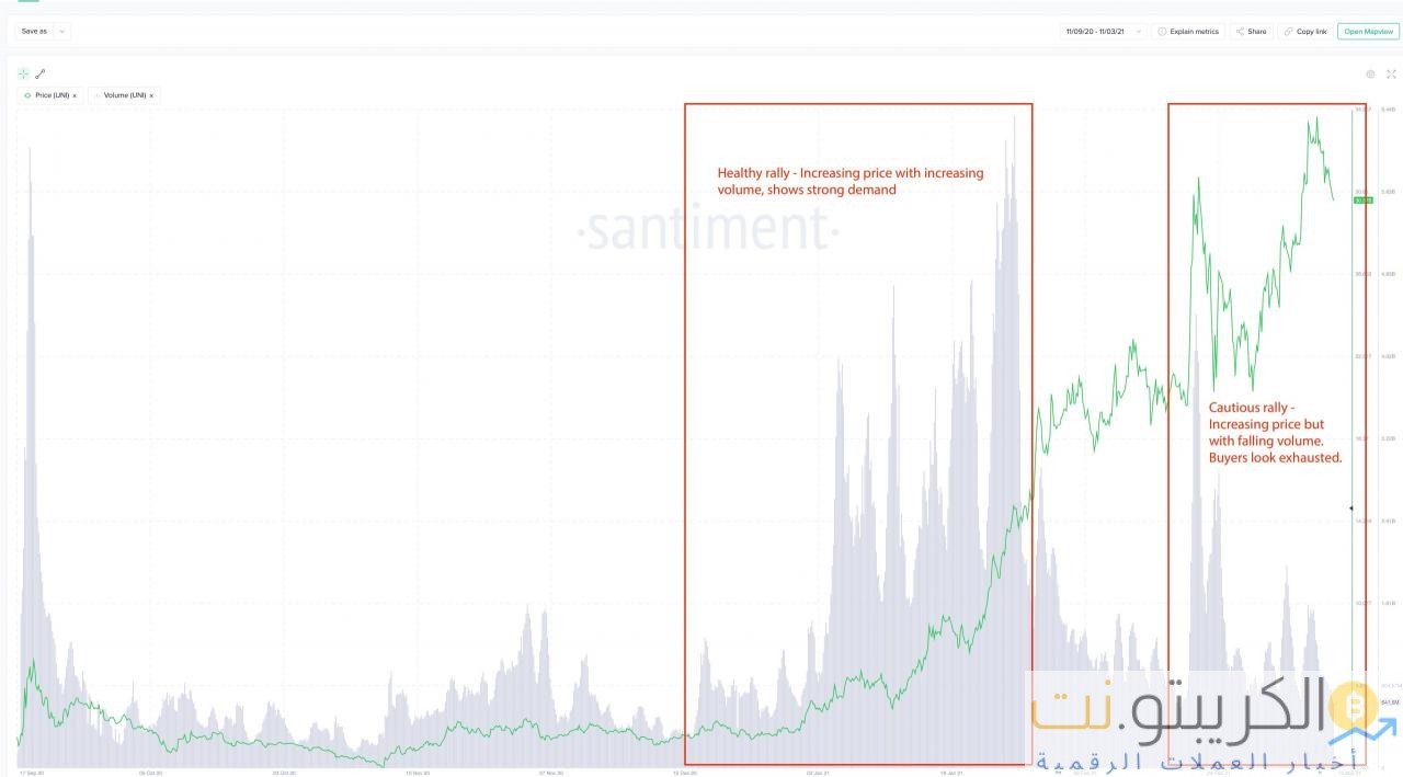في أبسط صوره ، يعتبر سعر الأصل وحجم التداول أفضل المؤشرات لكيفية أدائه. في حالة UNI ، بينما أنشأ الرمز المميز ATH بأكثر من 34 دولارًا قبل أن ينخفض للتداول حول 31 دولارًا في وقت النشر ، لم يكن الارتفاع المذكور مصحوبًا بزخم مماثل لحجم تداوله. ببساطة ، يبدو أن الاختلاف بدأ يترسخ ، حيث يشير أحدهم إلى أن هناك عددًا أقل من المشترين في المكان و “الطلب ينفد”.